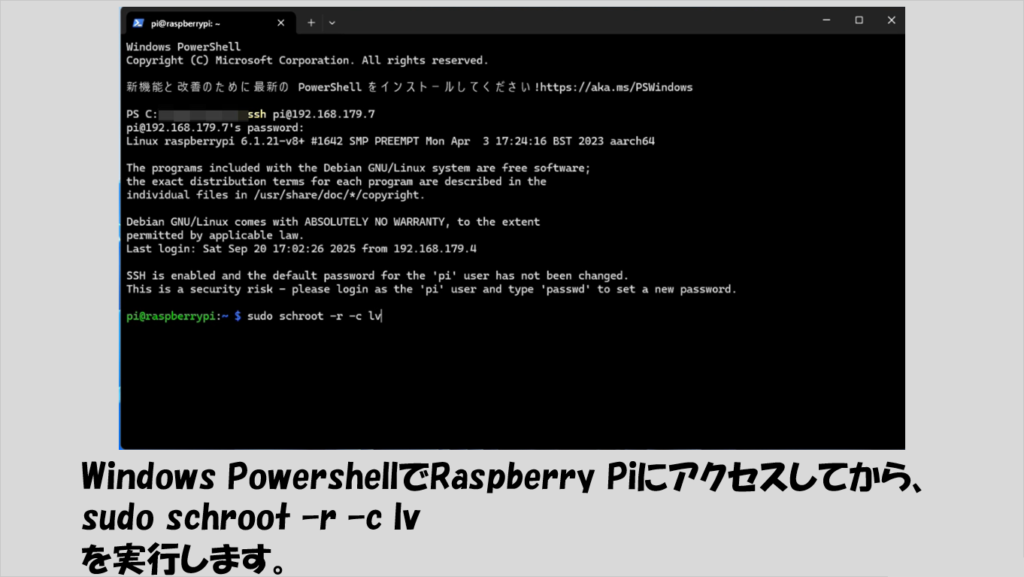 コマンドの入力はRaspberry Pi上で行いますが、今回はWindowsのPCでRaspberry Piと同じネットワーク環境にあるものからPowerShellでアクセスし、ここからコマンドを順番に実行しました。