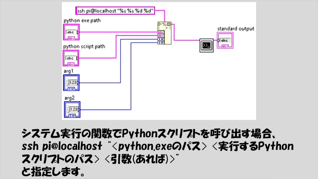 ssh pi@localhost “<python.exeのパス> <実行するPython スクリプトのパス> <引数(あれば)>”