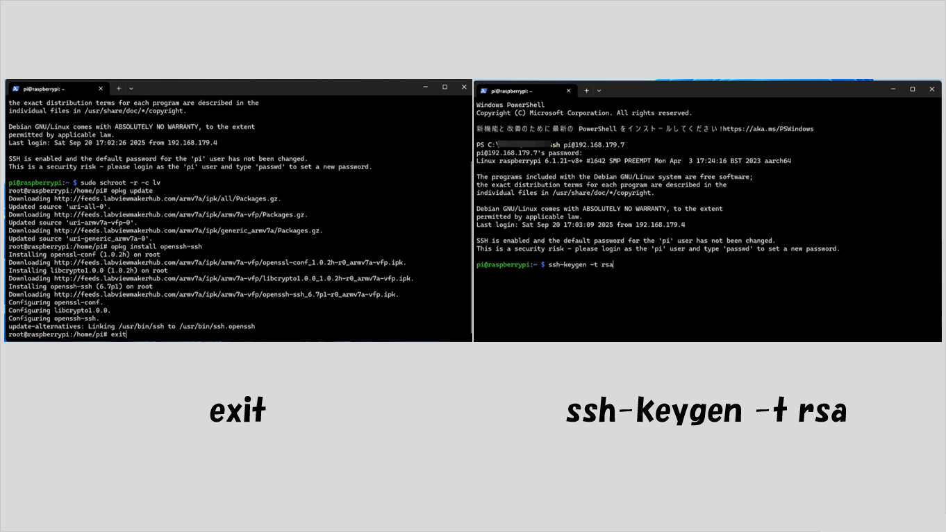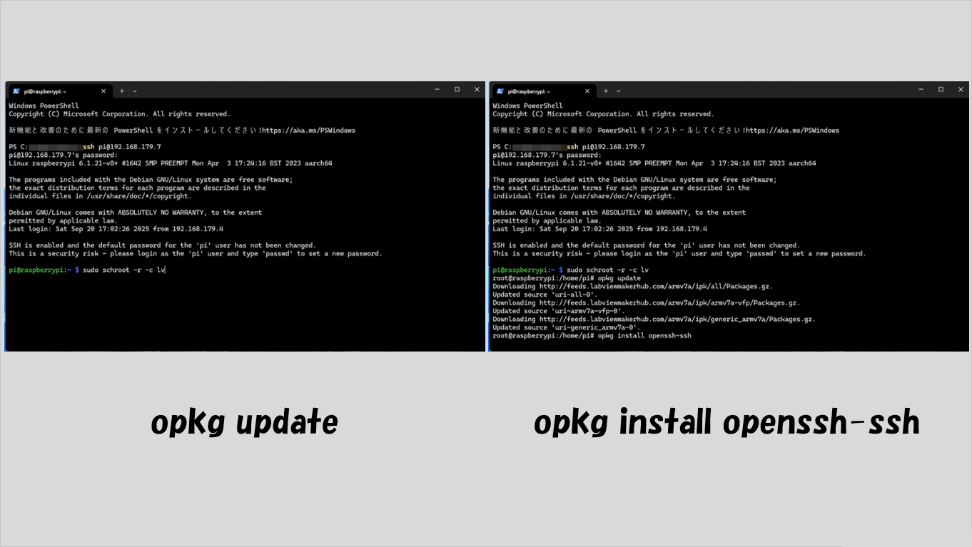 コマンドの入力はRaspberry Pi上で行いますが、今回はWindowsのPCでRaspberry Piと同じネットワーク環境にあるものからPowerShellでアクセスし、ここからコマンドを順番に実行しました。