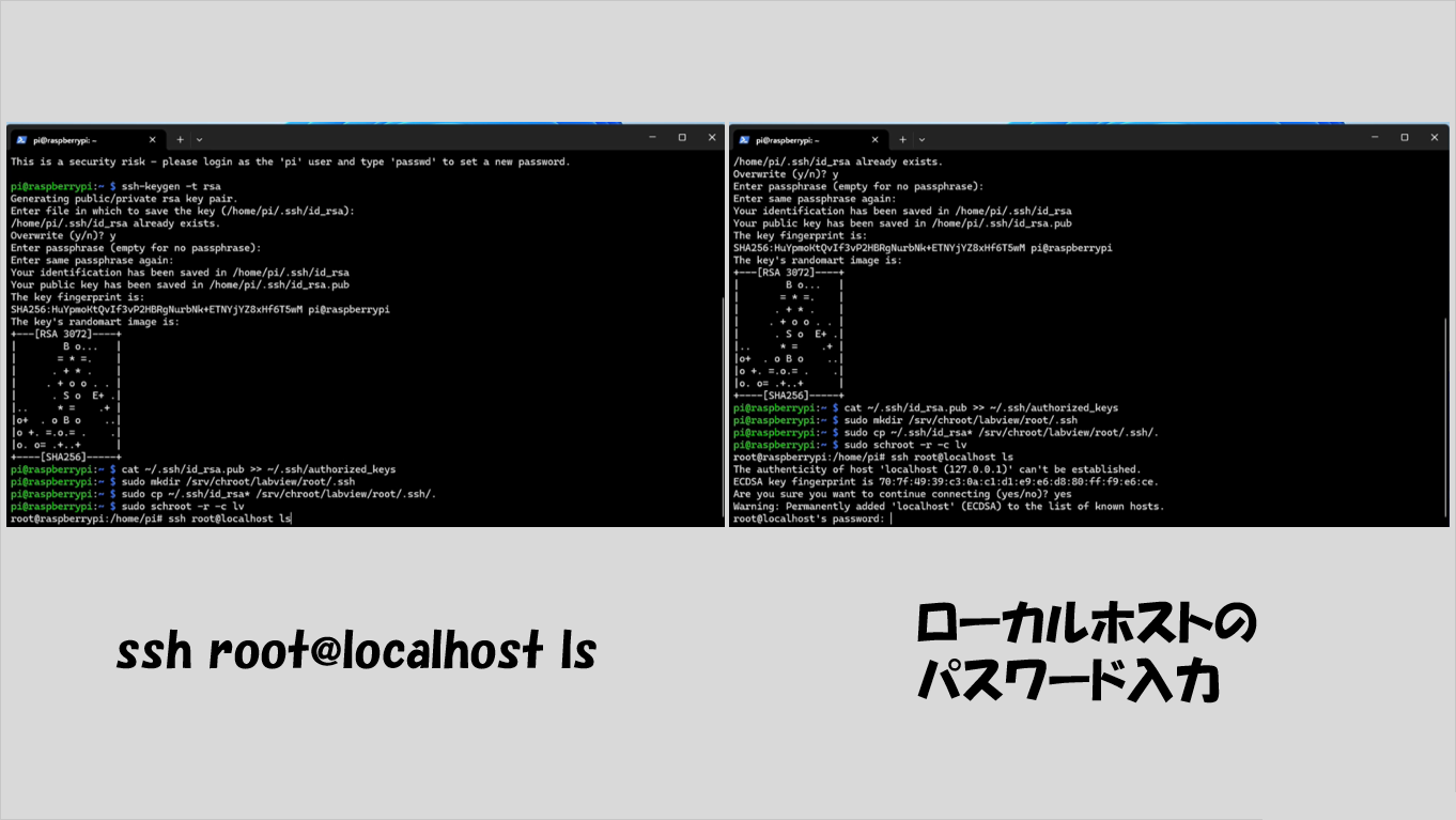 以下では、ユーザー名が「pi」であるRaspberry Pi環境にてsshでPythonにアクセスし何か特定の処理を行わせる例を紹介します。