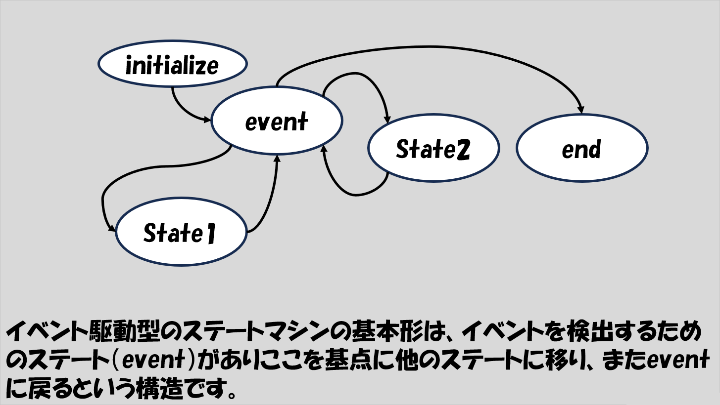 なお、あるステートからeventステート以外の別のステートに移ることももちろんできますが、最終的にはeventステートに移る必要があります。