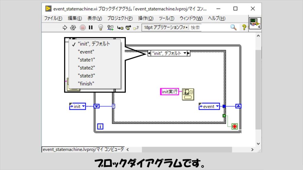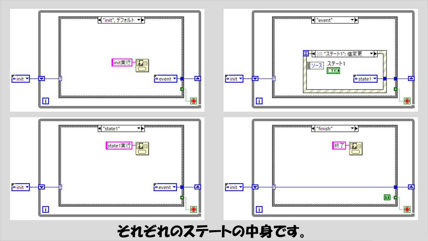 単純なステートマシンの作り方とは、ステートマシンがどうやって状態を移っていくか、そのためにLabVIEWでどのように組む必要があるかということがわかっていれば十分かなと思います。
