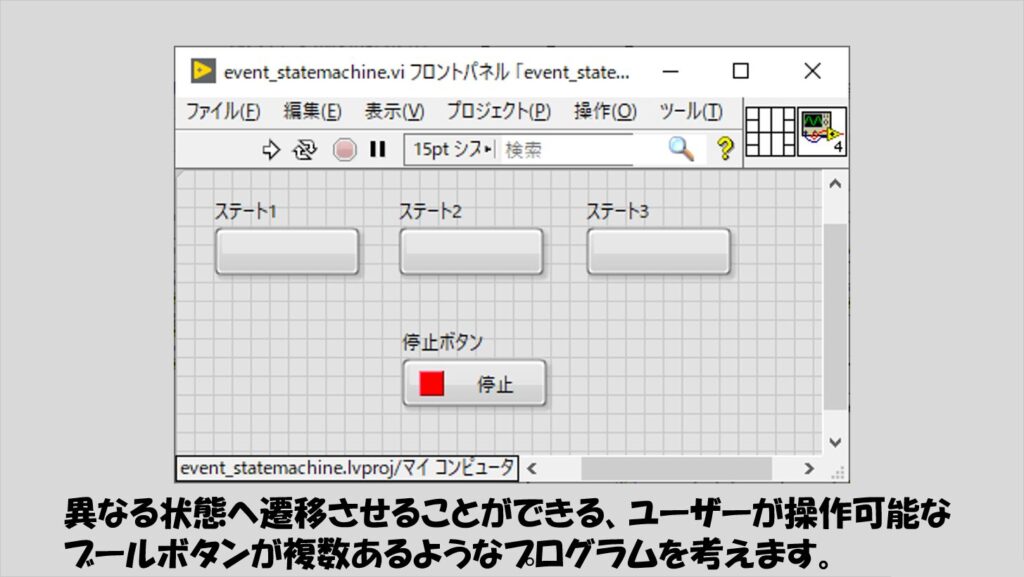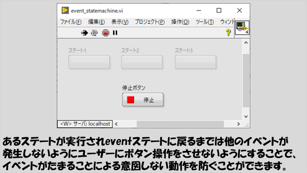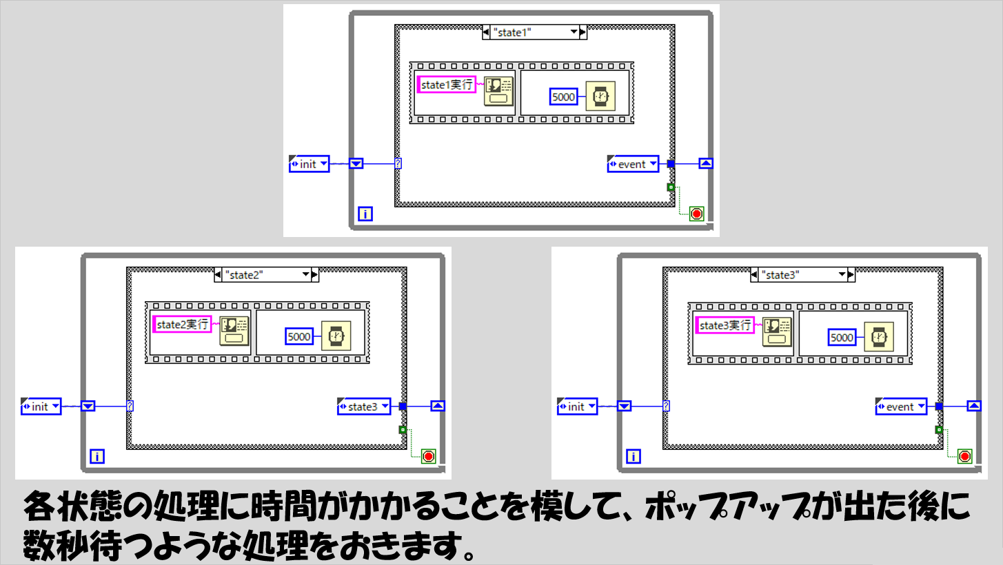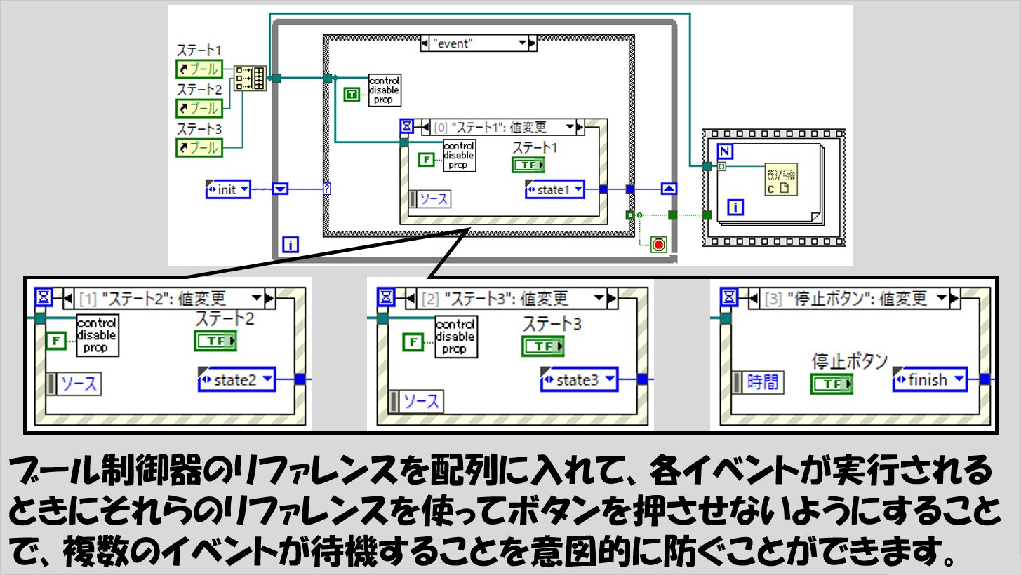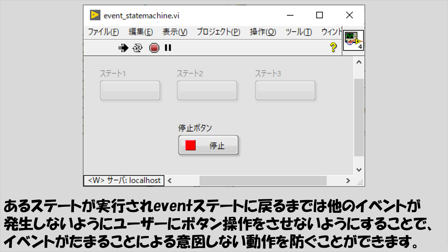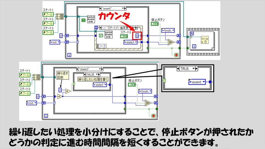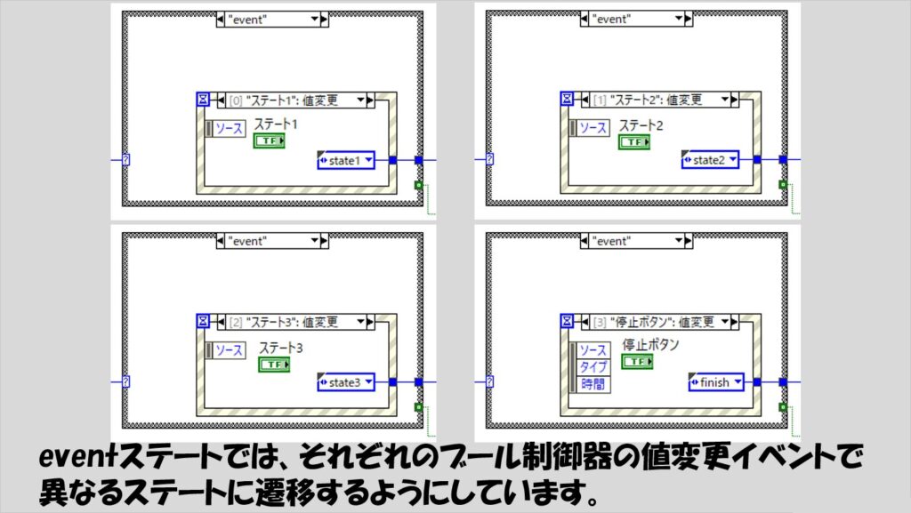 あれ、これだと停止ボタンはイベントストラクチャに入ってないけどいいの?と思うかもしれませんが、もしイベントストラクチャに停止ボタンを入れたまま上記のような組み方を実現させる場合には単純なステートマシンの構造では無理で、キューを使ったプログラムにする必要があります。