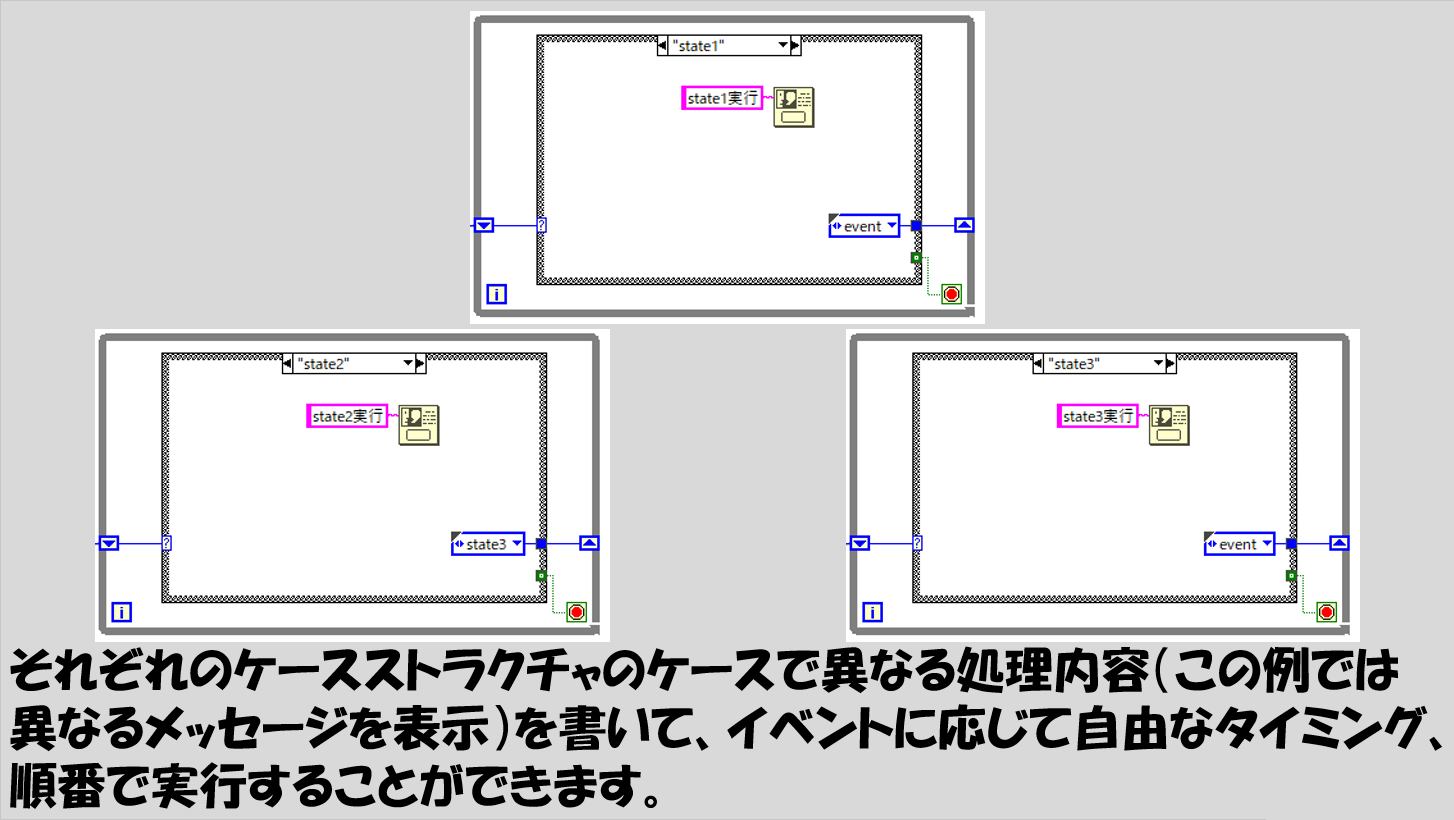イベント駆動型のステートマシンは、ケースストラクチャで定義するステートの一部にイベントストラクチャを配置し、発生したイベントに応じて次の状態を指定します。