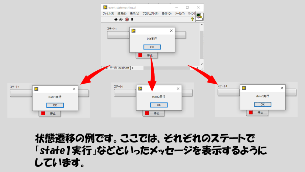 実行の状態を分かりやすくするため、ボタンが押されたら「state1実行」などと表示されるようにしておくと、プログラムの流れがわかりやすくなります。