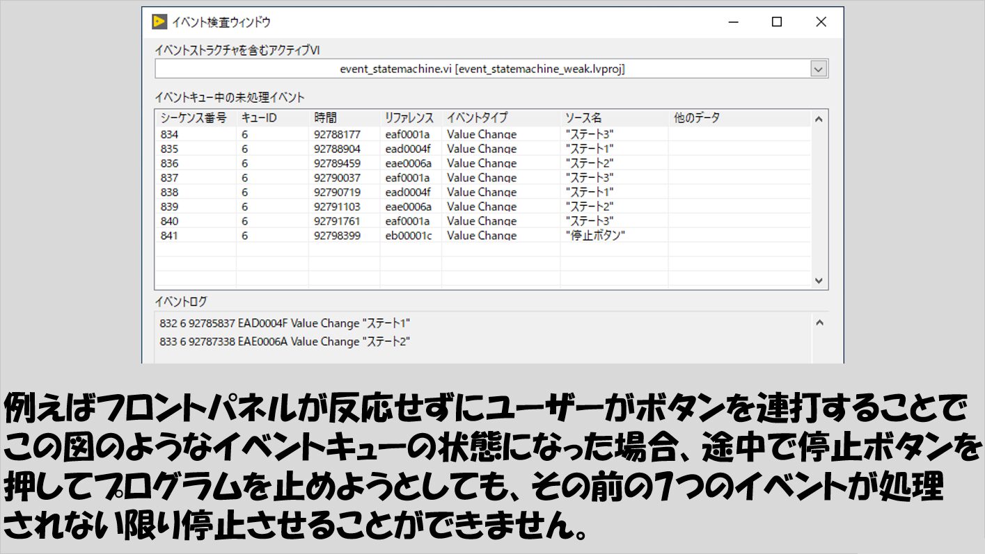 消費されずに残っているイベントは、イベントストラクチャを使用したプログラムのデバッグで有効な、イベント検査ウィンドウ(メニューバーの「表示」から選択)で確認することができます。