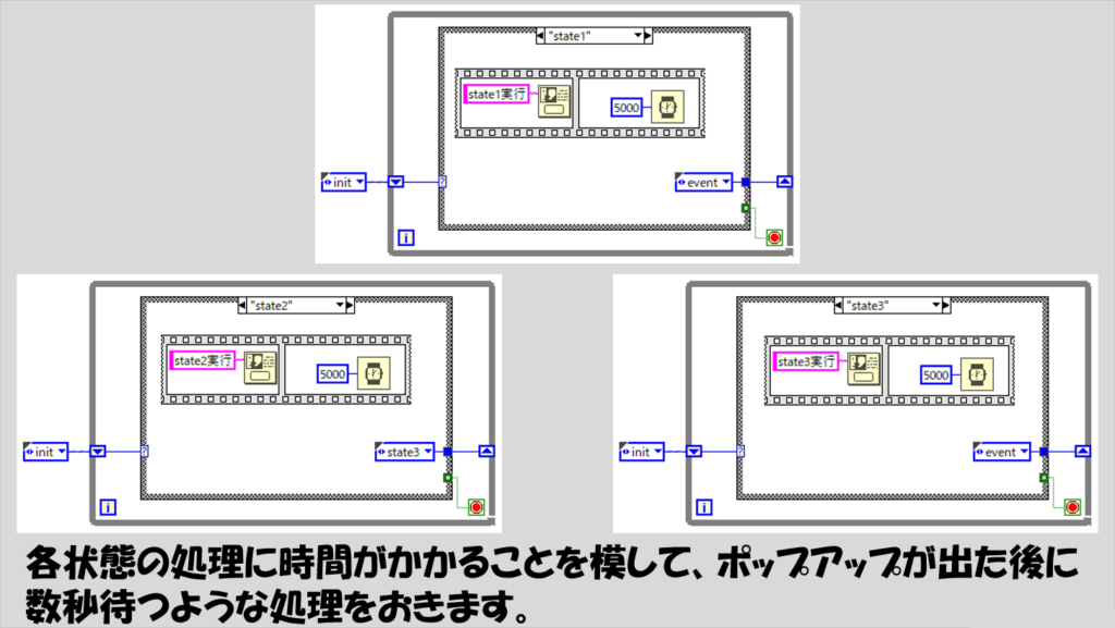 これは、各ステートでわざと時間がかかるようにし、eventステートにすぐには戻らないような場面を意図的に作っています。