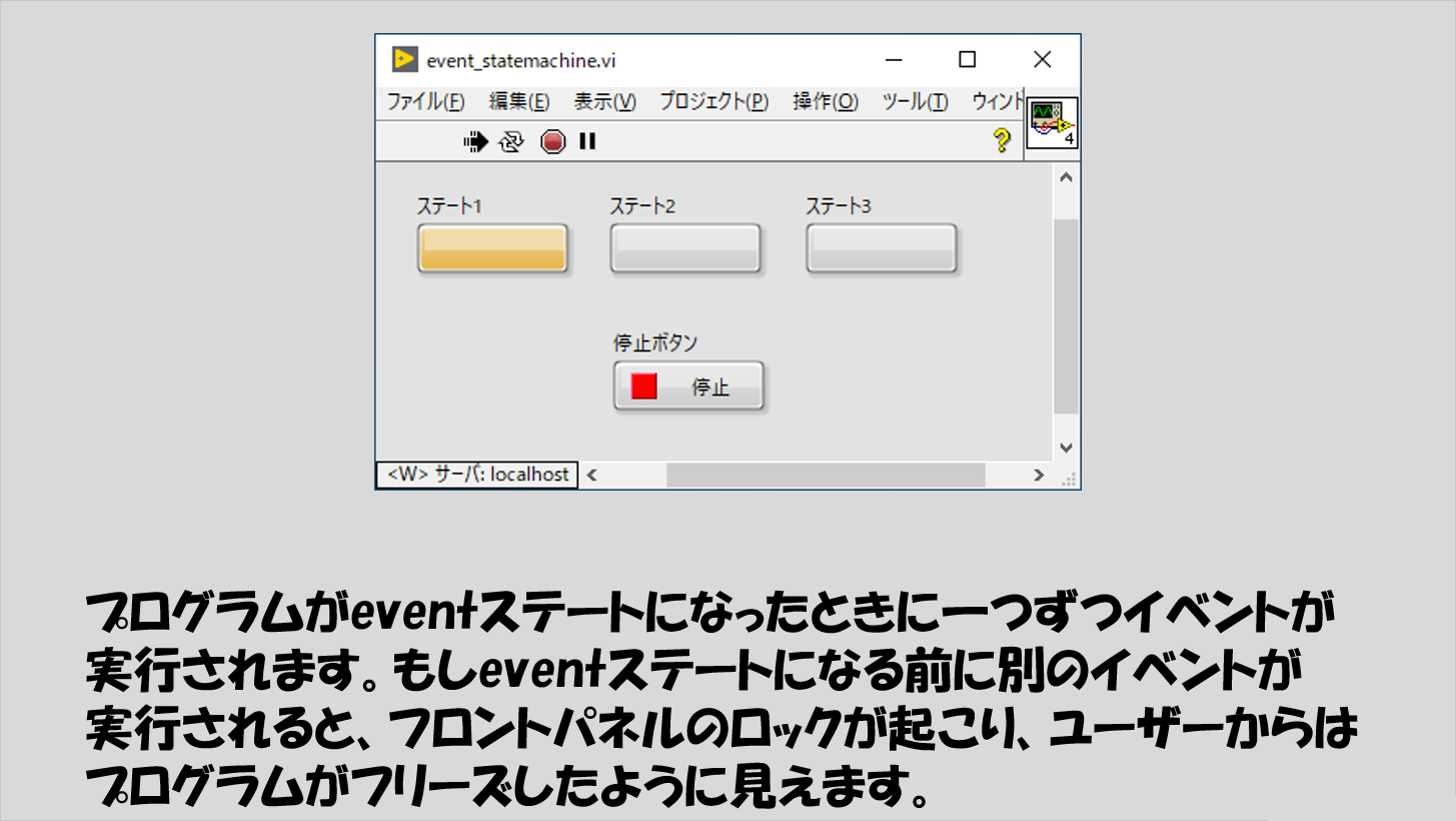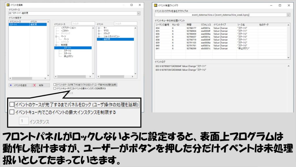 このとき、ボタンを押すことで指定した状態に移ること自体はできるのですが、その状態からeventステートに戻ってくるまでの間にユーザーがさらにボタンを押した場合、フロントパネルはロックされてしまいます。