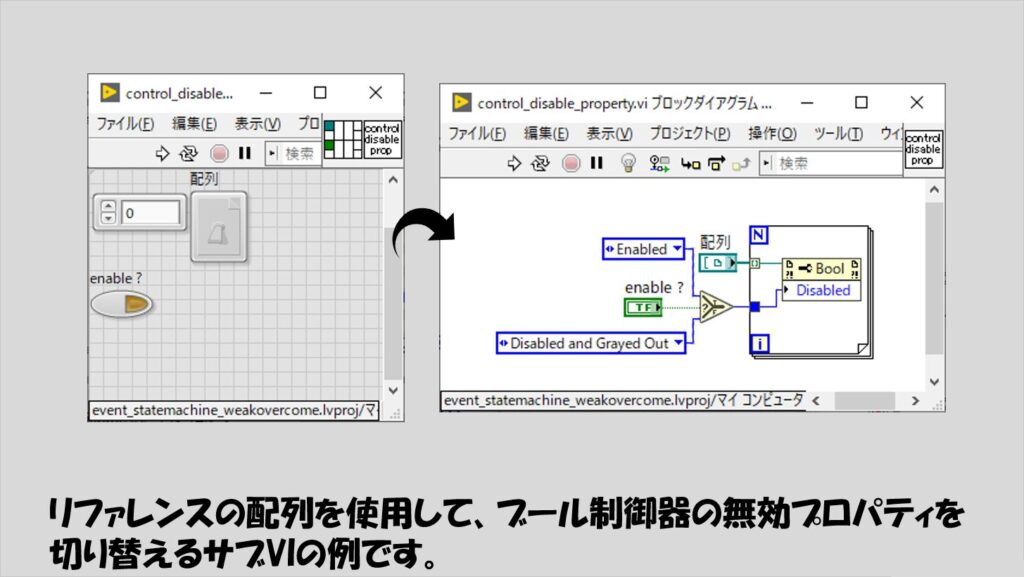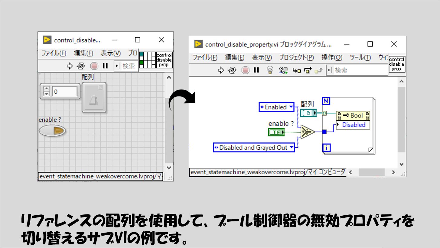 サブVIは以下のようにしておくと複数のボタンに対してまとめて無効プロパティを設定できるので便利です。