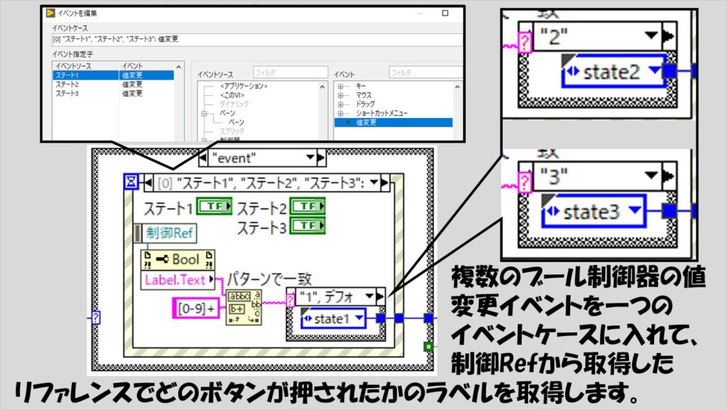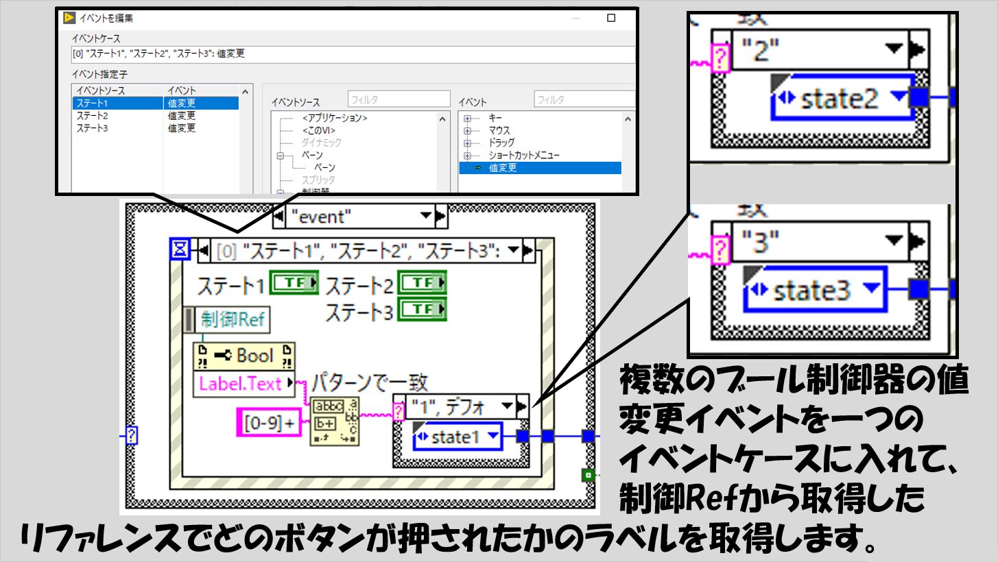 例えば、押されたボタンのラベルの名前から「どのブール制御器が押されたか」を判断し処理内容を変えれば、一つのイベントケースでそれぞれのボタンの値変更イベントを登録することでイベントケースを増やさなくても済みます。