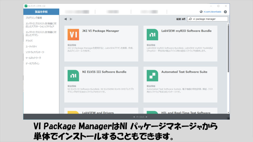 VIパッケージマネージャは、よく似た名前のNIパッケージマネージャが「NI製のソフトウェアを管理するためのツール」であるのに対して、「LabVIEWで使用できるツールキットを管理するためのツール」です。