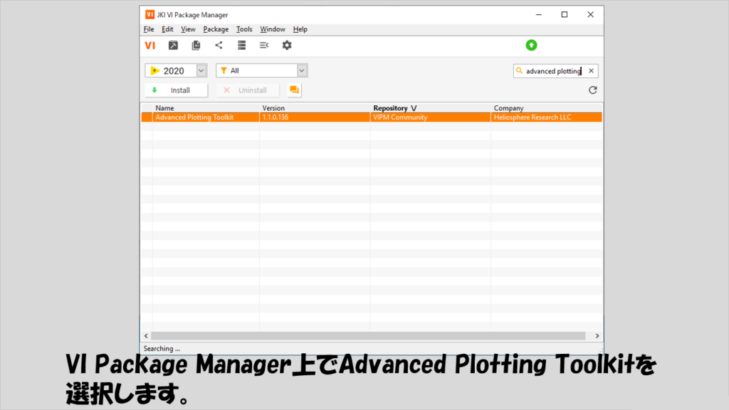 インストールの手順は単純で、VIパッケージマネージャを開いて、Advanced Plotting Toolkitを検索して開きます。
