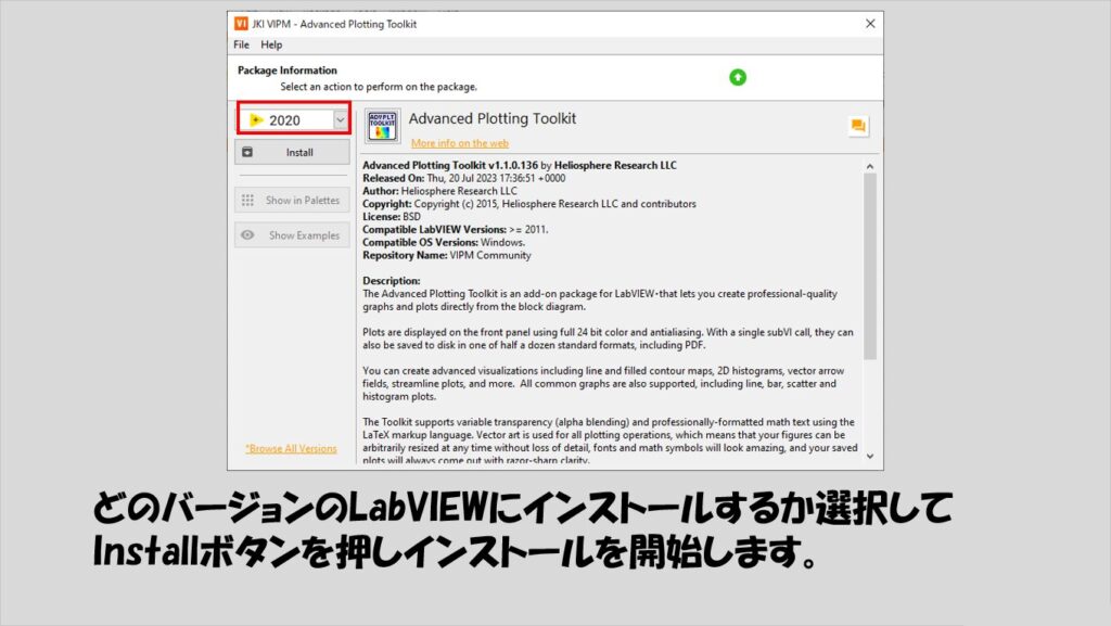 項目を選択して、使用したいLabVIEWのバージョンを選択し、Installをクリックします。