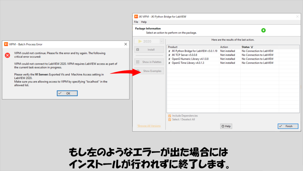 もしインストールの途中で以下の図のようなエラー(以下の図はAdvanced Plotting Toolkit選択時のエラーではないですが似たようなエラーに出くわす可能性はあります)が出た場合には、インストールは行われず終了します。