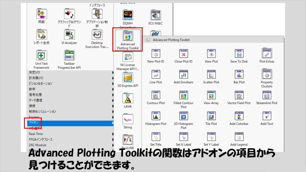 これにより、LabVIEWの関数パレットのアドオンのカテゴリから専用の関数が使えるようになります。