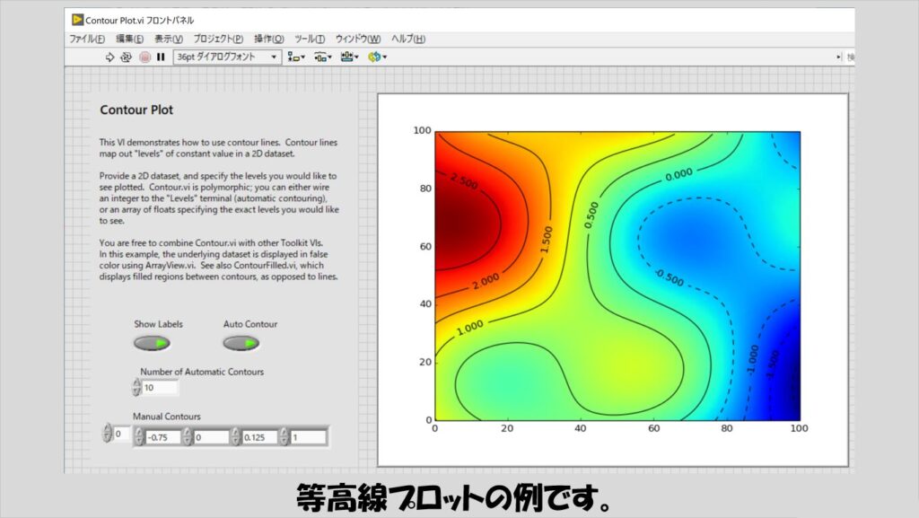 それぞれがサンプルプログラムとして付属してくるので、そのサンプルプログラムのブロックダイアグラムを見ればおおよそ関数の使い方はわかりますし、何ならサンプルプログラムの中で具体的に数値データを入力している部分(定数で書かれています)を、実際に自分たちのデータに置きかえればそれだけで見栄えのいいグラフを表示できるようになります。