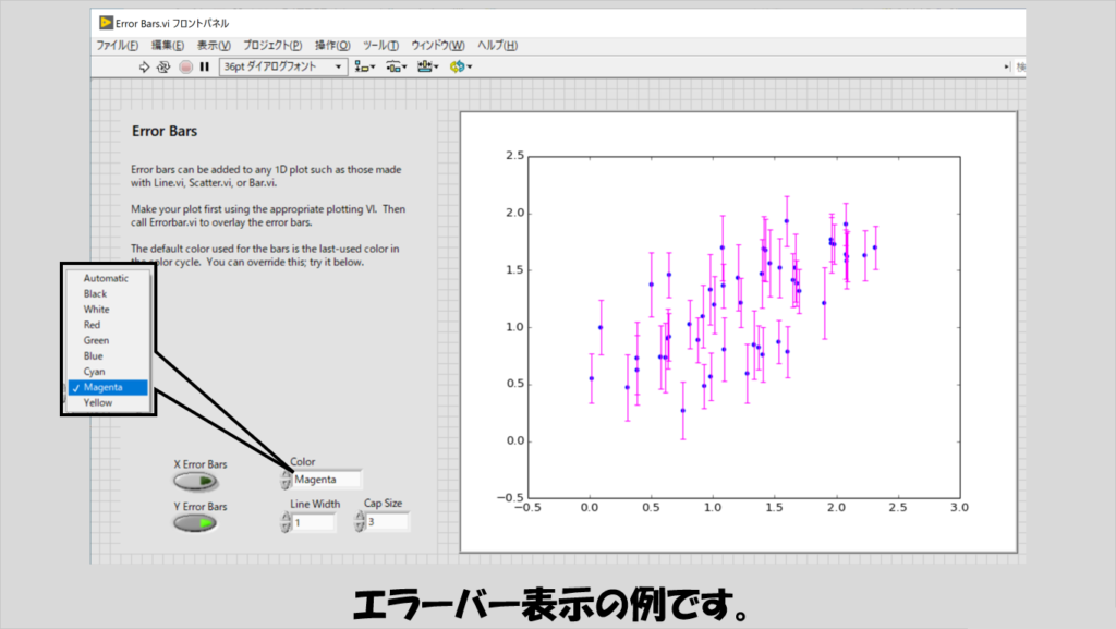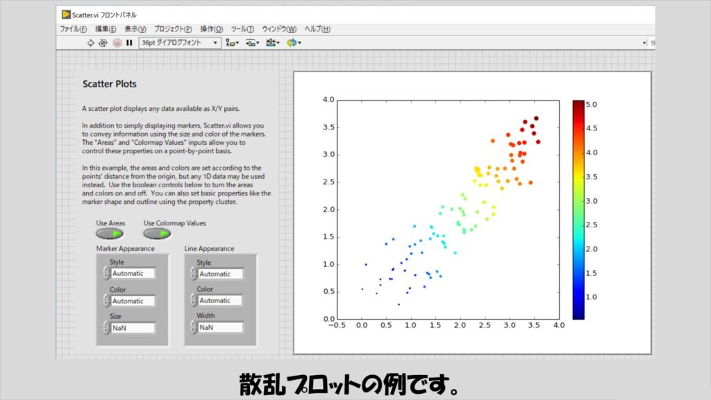 LabVIEWでもXYグラフで散乱プロットを扱えますが、こちらの方が鮮やかに、見やすく表現できます。