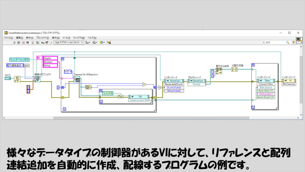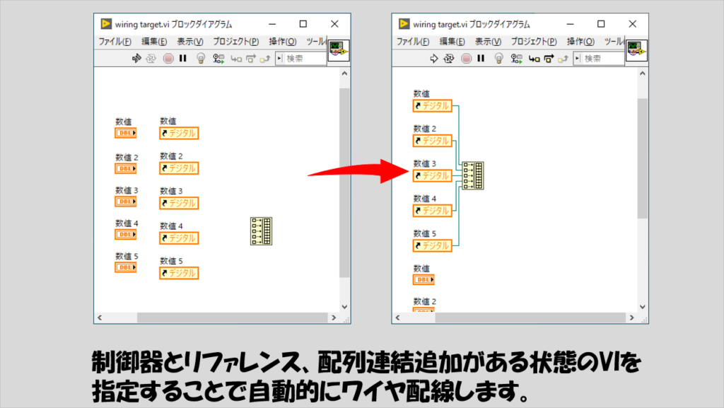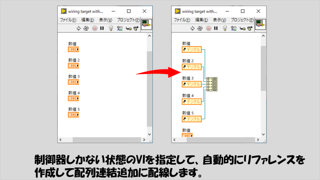 まずは、既に制御器以外にもリファレンスや配列連結追加をブロックダイアグラムに配置しているVIを指定して、配線を自動的に行わせる場合の例です。
