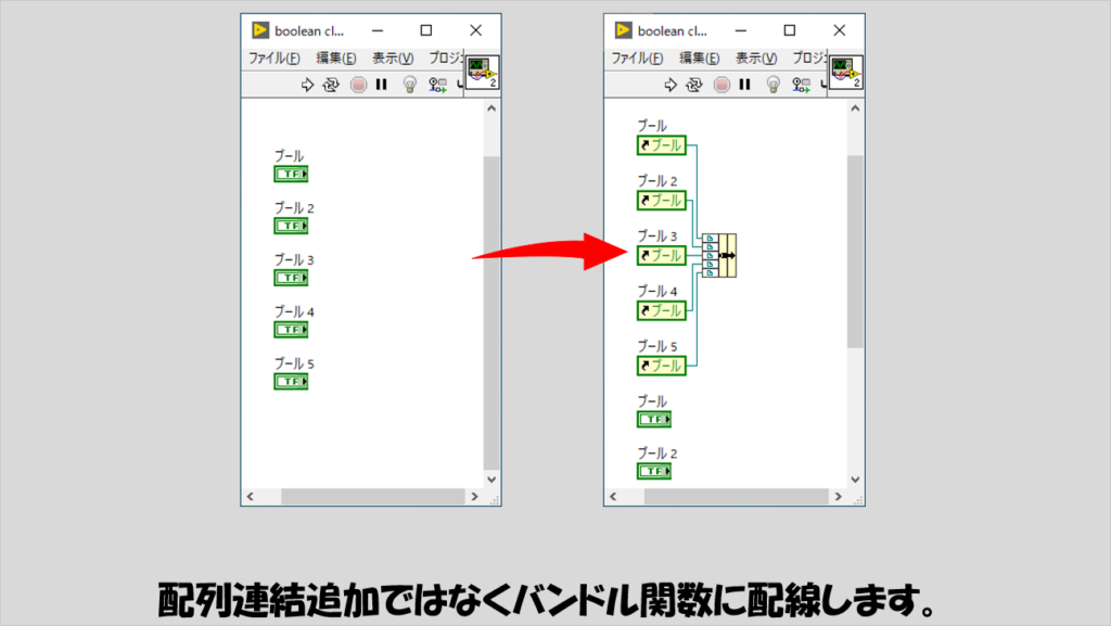 配列連結追加ではなくバンドル関数を使用する場合、最初の「新規VIオブジェクト」で配列ではなくバンドル関数を指定することと、途中、配列サイズから2を引いた値をインボークノードに指定している部分があります。