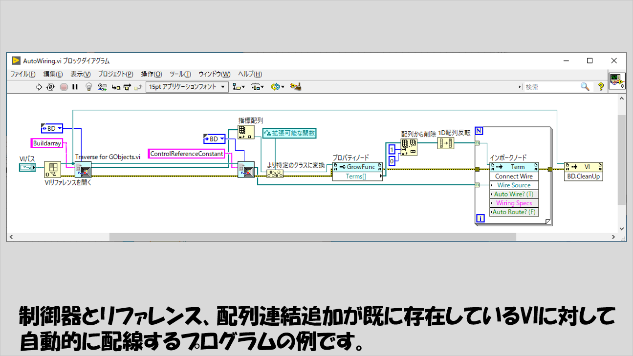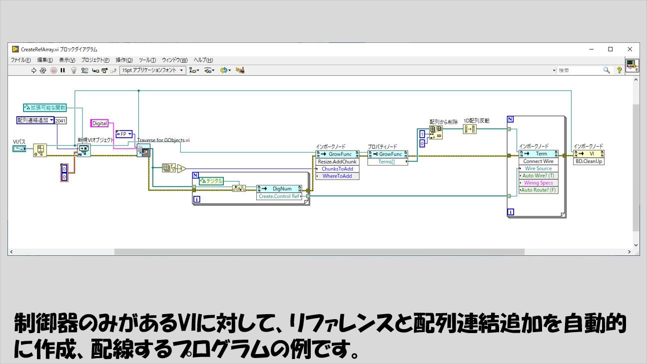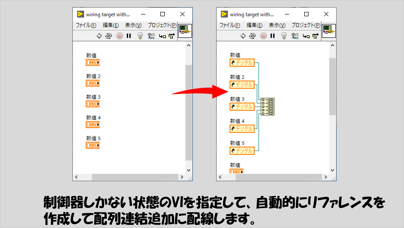 まずは、既に制御器以外にもリファレンスや配列連結追加をブロックダイアグラムに配置しているVIを指定して、配線を自動的に行わせる場合の例です。