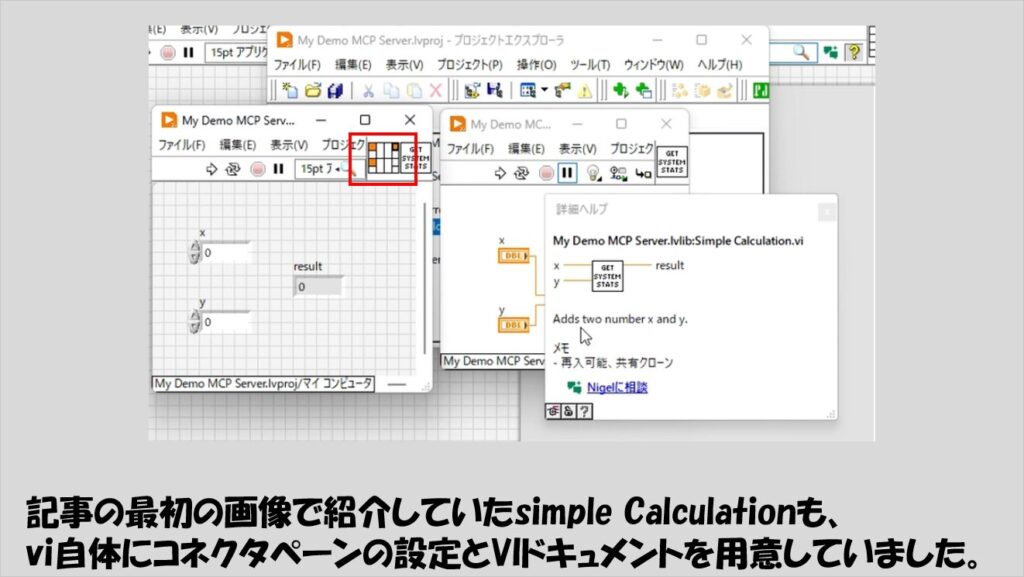 Simple MCP Serverのサンプルでできるのはここまでですが、Add Toolの関数に渡すviを増やすとそれだけできることも増えます。