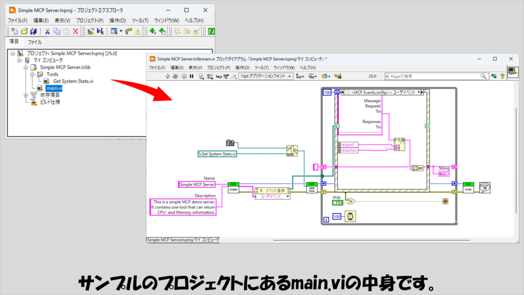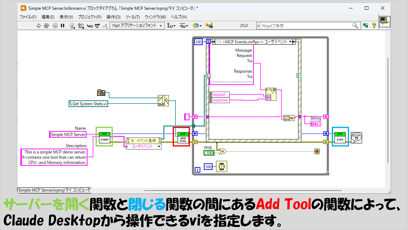 Main.viのブロックダイアグラムを見ると、MCP Server Toolkitの関数としては3つしか使われておらず、そのうちの二つはサーバーを開くのと閉じるための関数になっています。