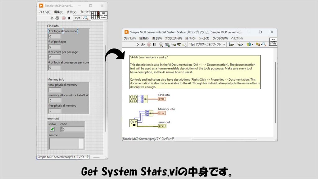 このサンプルでは、Get System Stats.viが対象となっていて、サンプルのプロジェクトにあるこのviを開くと、PCのメモリ状態などを調べ結果を返すプログラムだとわかります。