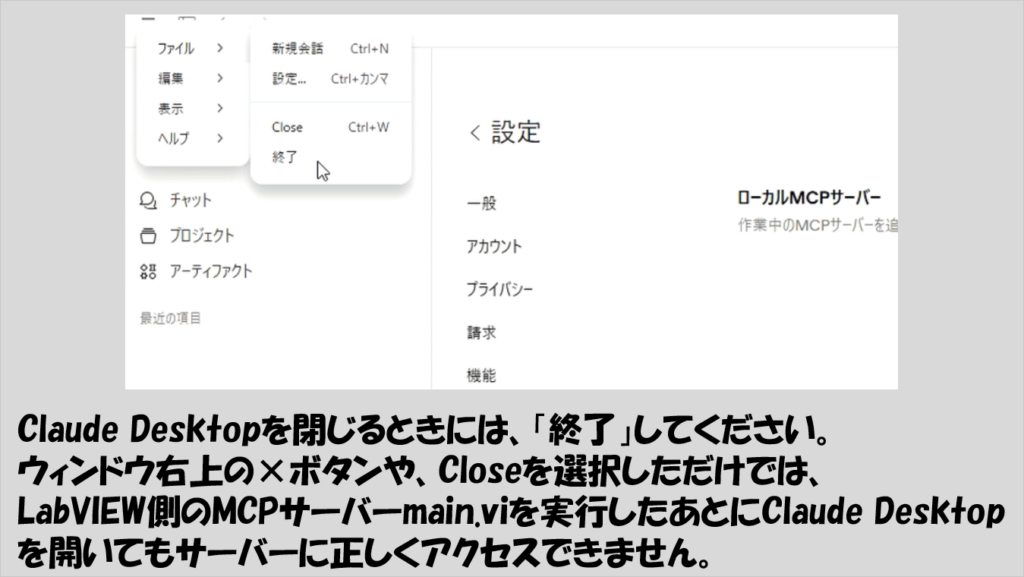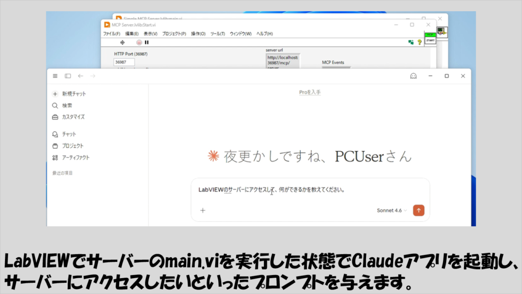 (これ以降でも、LabVIEW側から新しくサーバー用のmain.viを実行するたびに、Claude Desktopは完全に終了した状態から新規で開く必要があります。)