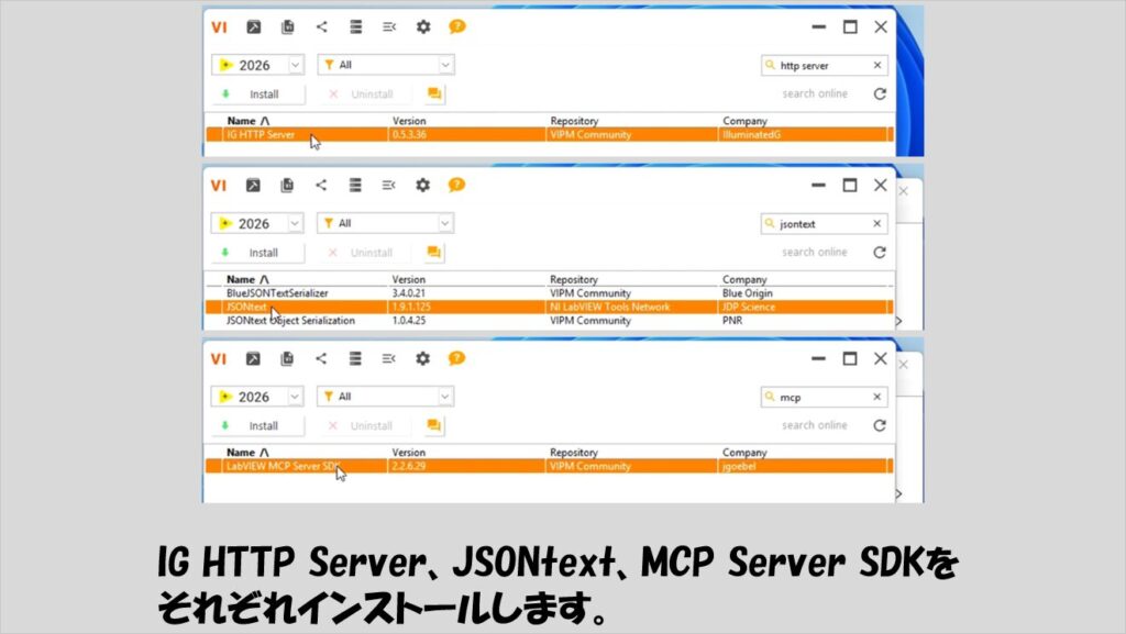 が、このツールキットを使用するにはさらに前準備として以下のパッケージが必要です。(MCP server toolkit含めすべて無料で、VIパッケージマネージャからインストールするだけですが)