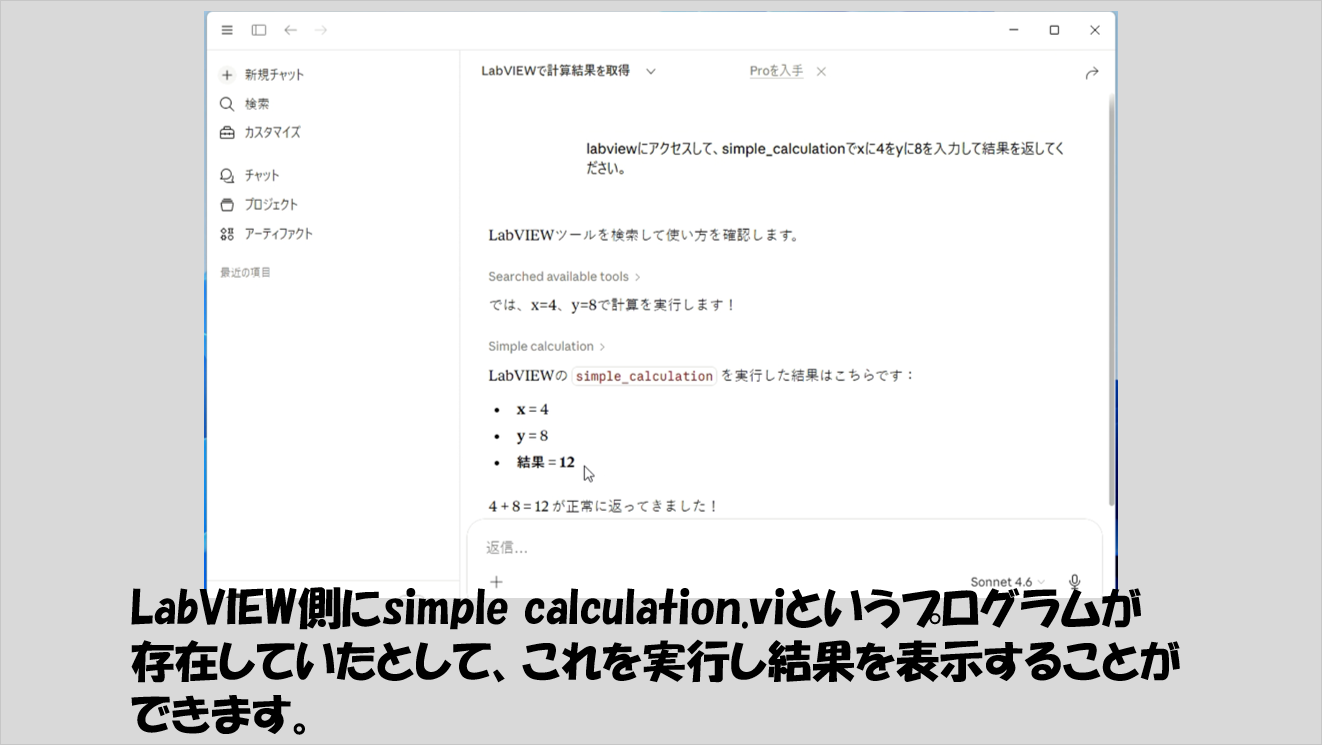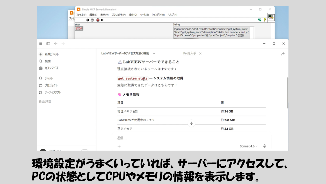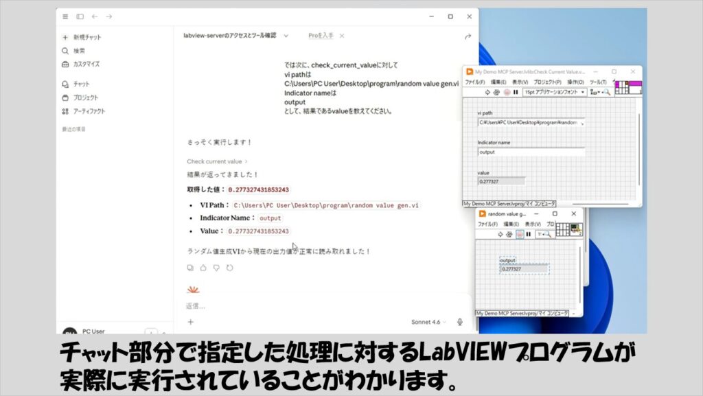 アクセスすることによって、Claude DesktopがLabVIEWが立てたMCP サーバーに登録したviに対し制御器に値を渡して実行、その結果を受け取って、チャット画面に表示できるようになります。
