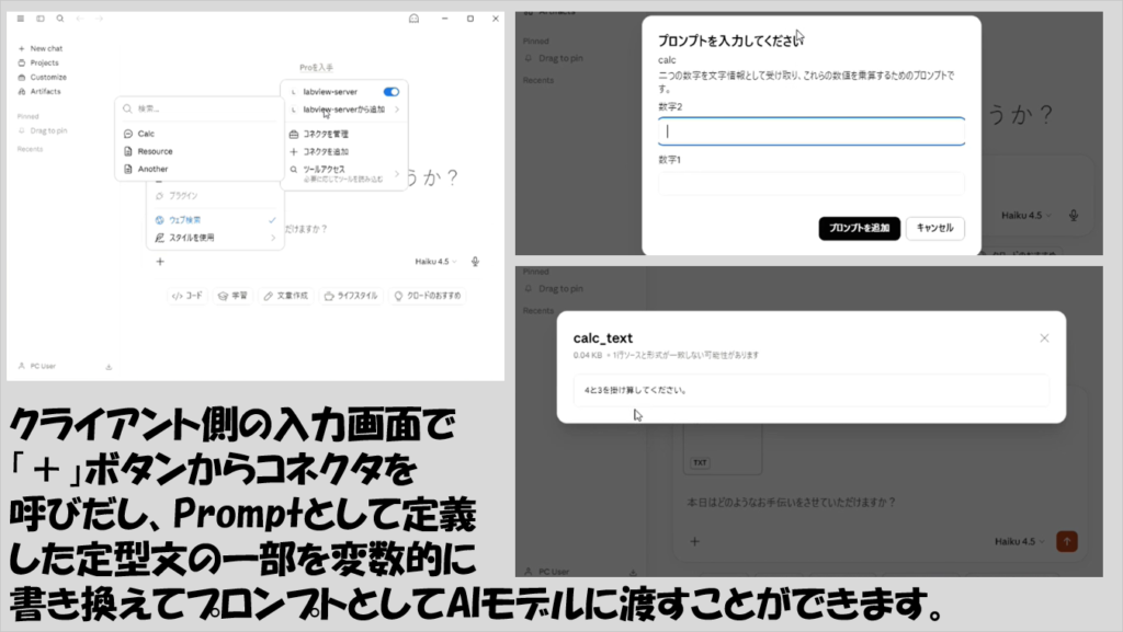 この状態でサーバーを実行、クライアントからアクセスすると、クライアント側のチャット入力画面にある「+」ボタンからプロンプトを呼び出して、特定の定型文の一部をユーザーが書き換えられるような形でダイアログが表れます。
