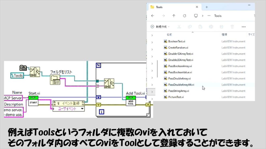 複数の機能を持たせ、かつviの入れ替えを頻繁に行うような状態ではいちいちviのファイルパスで指定するのは面倒なので、特定のフォルダ(下の図ではToolsというフォルダ)にTool用のviをまとめていれ、その中身をフォルダをリスト関数で読み出すようにすれば、メインのviを変更せずともToolとしてのviを自由に増減できます。