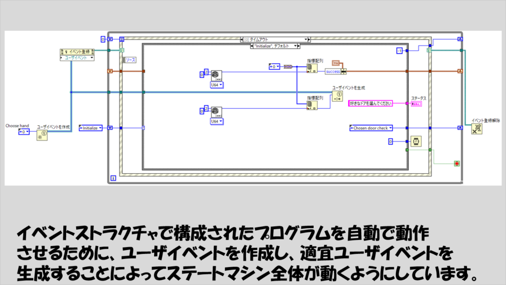 なお、上記での実装はイベントストラクチャをベースにしていたので、これをどう自動化するか想像がつかないという方もいるかもしれませんが、プログラム的にイベントを発生させるためにユーザーイベントを使用すれば割と簡単に自動化できます。