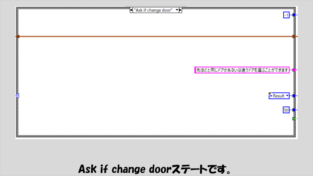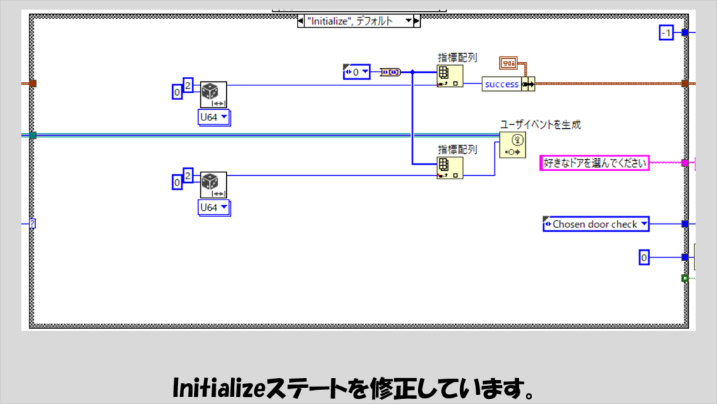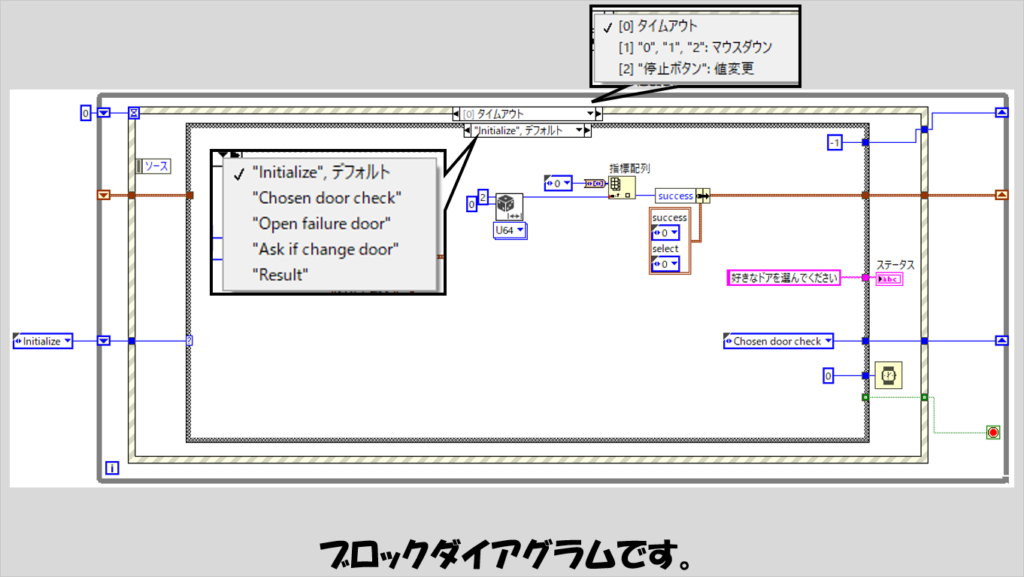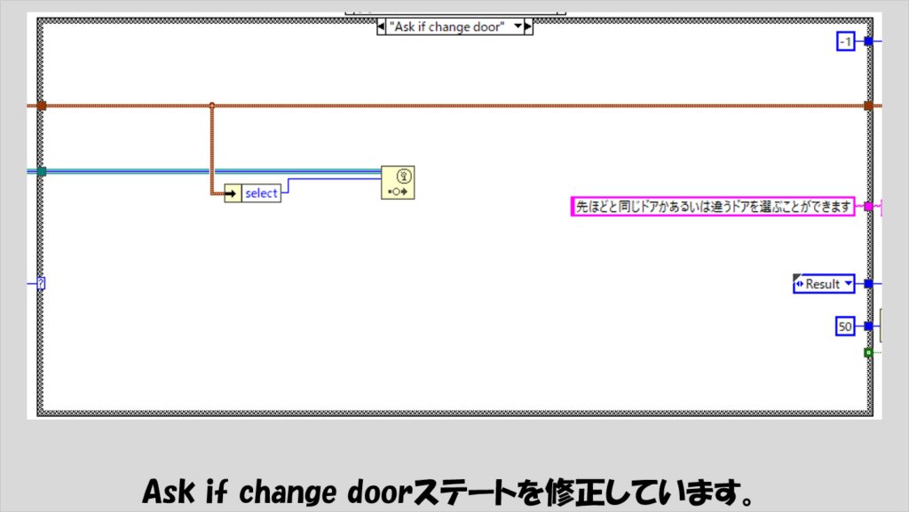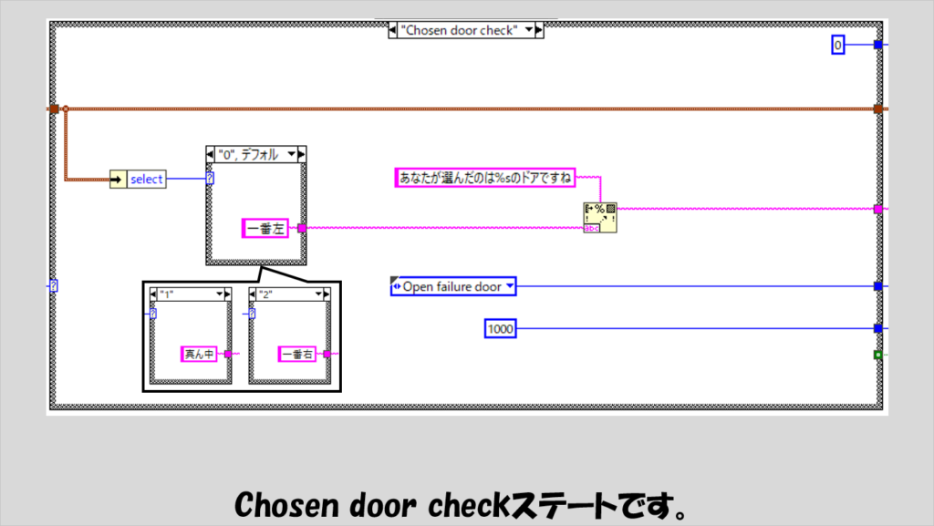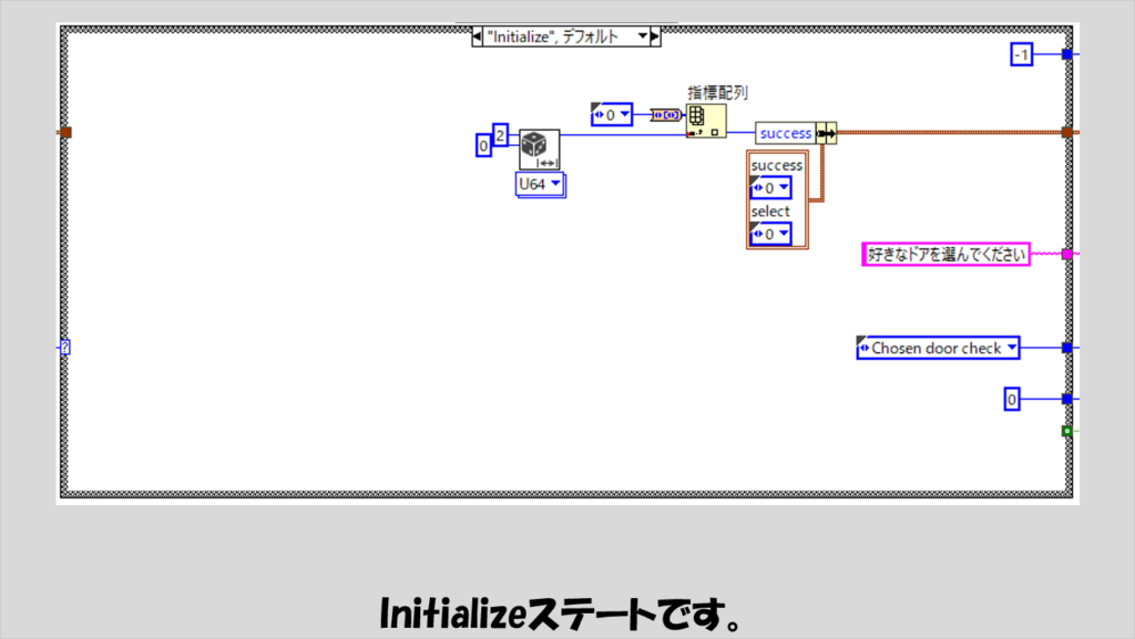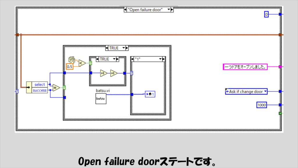 ここで、ユーザーが最初に選んだドアが正解のドアか、不正解のドアかで処理が変わります(下の図の、selectとsuccessが等しいかを判定した後のケースストラクチャで分岐します)。