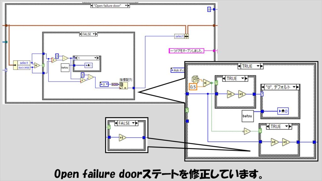 以下の図で中のケースストラクチャの全てのケースを表していませんが、Open failure doorでbatsu.viを使用したのと同じ要領なので割愛しています。