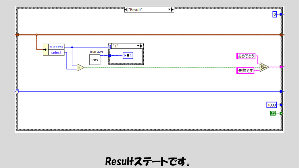 ここを列挙体ではなくただの数値でやる場合、ケースストラクチャの場合分けが「正解が0だった場合」「1だった場合」「2だった場合」の3つになり、分岐の種類が多くなってしまいます。