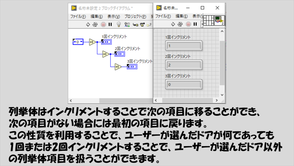 本記事ではモンティホール問題をLabVIEWで表現する方法を紹介しました。