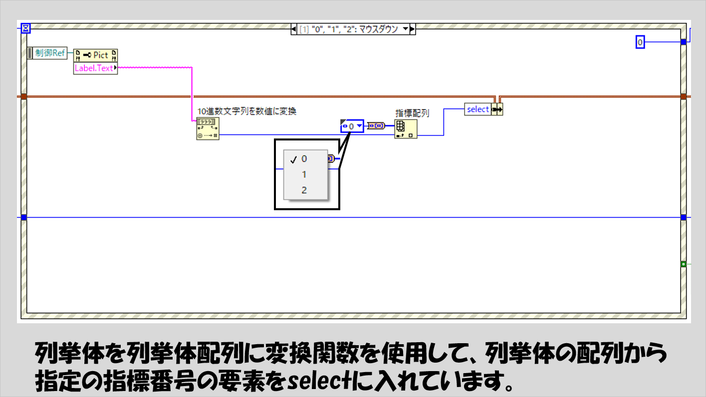 ここを列挙体ではなくただの数値でやる場合、ケースストラクチャの場合分けが「正解が0だった場合」「1だった場合」「2だった場合」の3つになり、分岐の種類が多くなってしまいます。