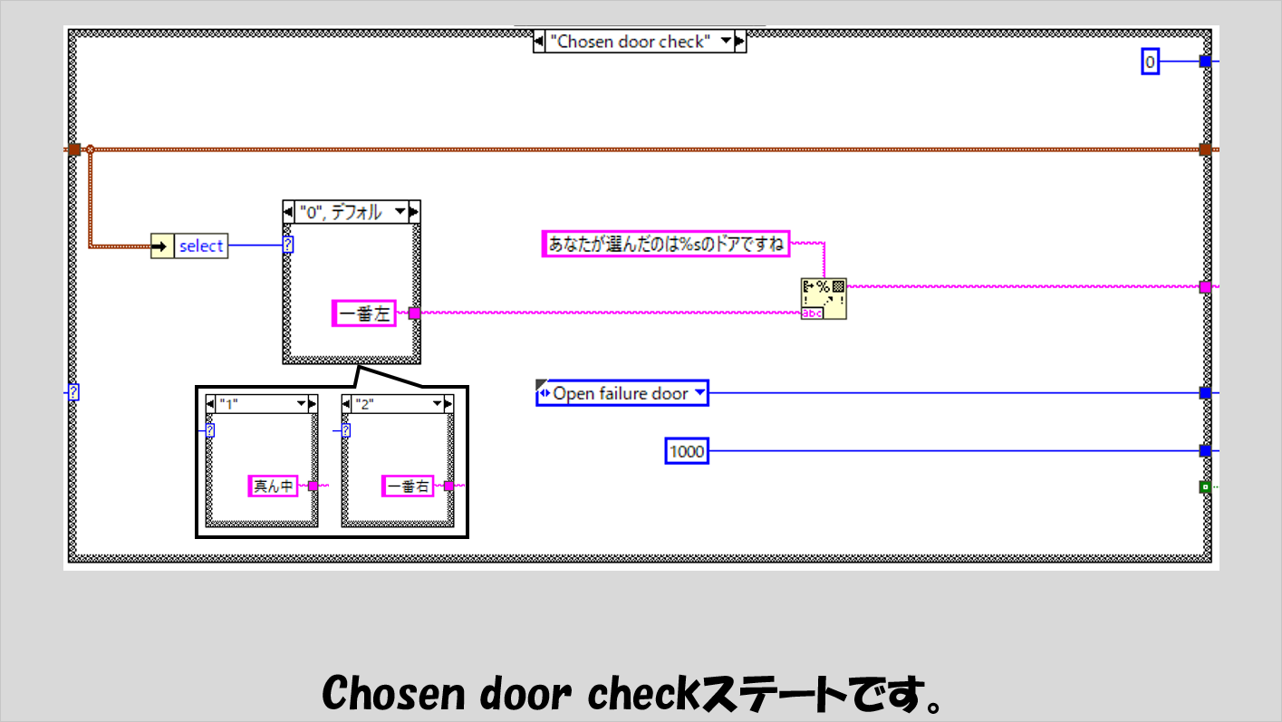 ここで、ユーザーが最初に選んだドアが正解のドアか、不正解のドアかで処理が変わります(下の図の、selectとsuccessが等しいかを判定した後のケースストラクチャで分岐します)。