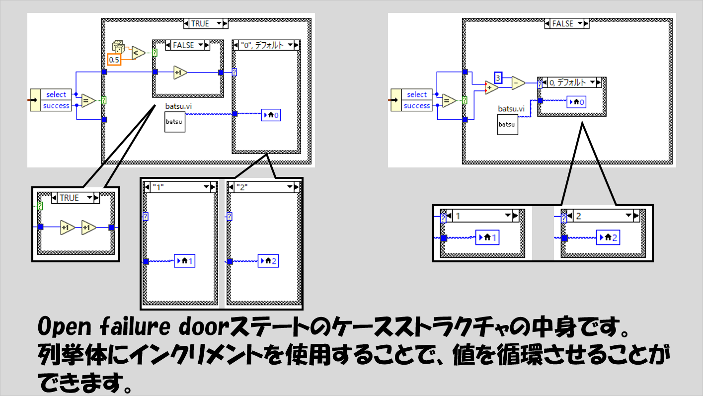 以下の図で中のケースストラクチャの全てのケースを表していませんが、Open failure doorでbatsu.viを使用したのと同じ要領なので割愛しています。