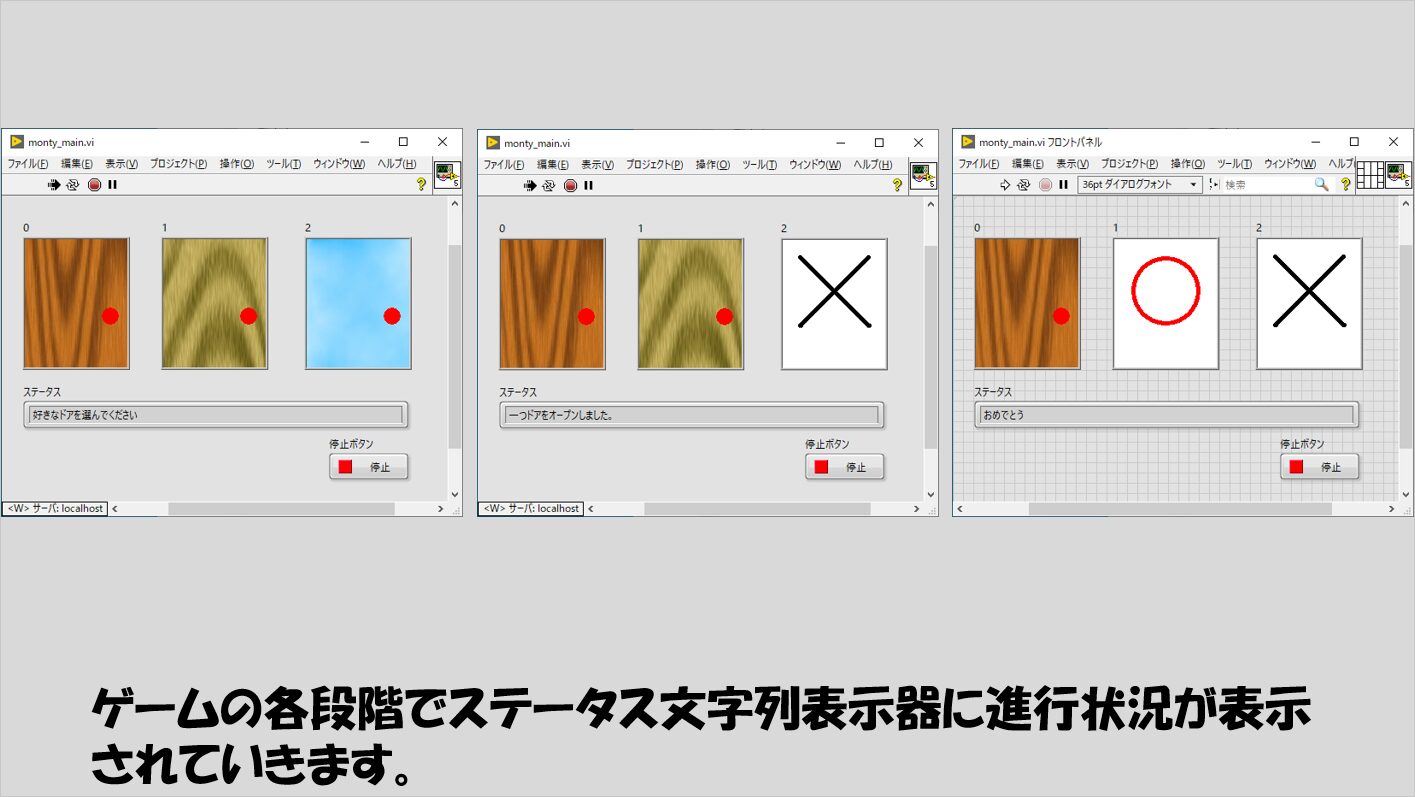 本記事ではモンティホール問題をLabVIEWで表現する方法を紹介しました。