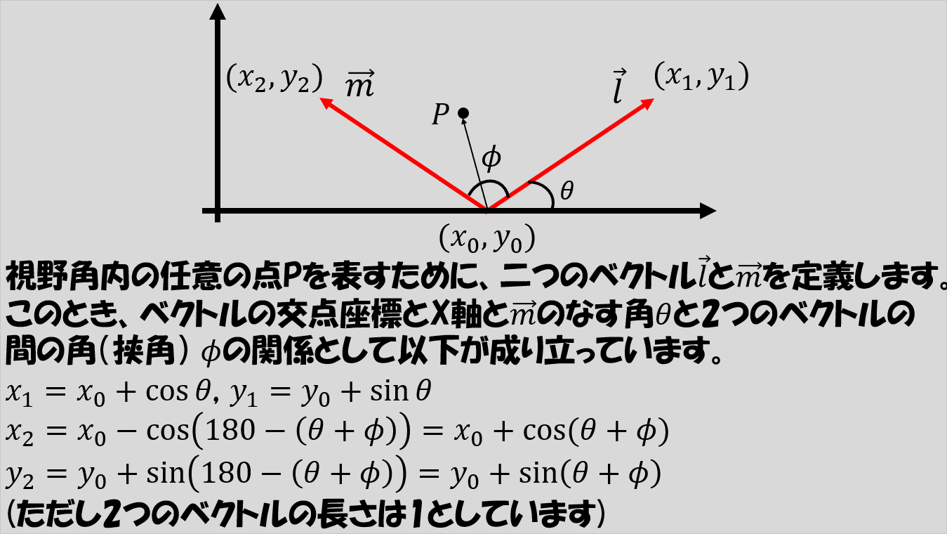二つのベクトルをそれぞれl、mと呼ぶことにして、これらが単位長さ(長さが1)であるとしたとき、二つのベクトルの交点の座標(x_0,y_0)と、lベクトルの先端位置(x_1,y_1)およびmベクトルの先端位置(x_2,y_2)について以下の関係式が成り立つことがわかります。