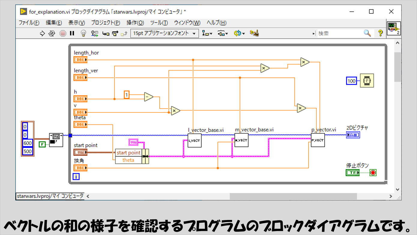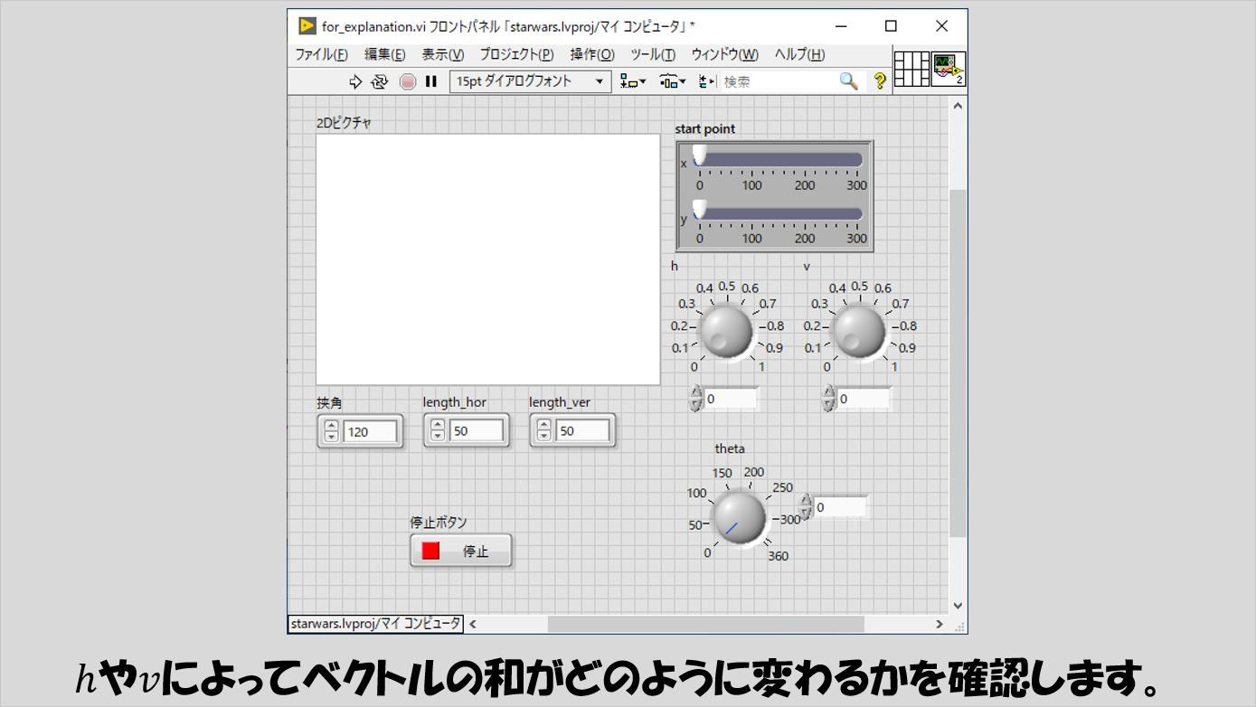 ここは、LabVIEWでピクチャを扱うプログラム自体の難しさがありますが、計算式は今まで説明した通りなので、何となくやっていることは分かるかなと思います。