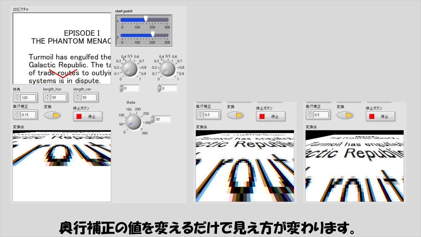 元々文字は2次元だったのを流れるように見せる、つまり奥行きの感覚を追加するということで、これは2次元を疑似3次元に変換した形となります。