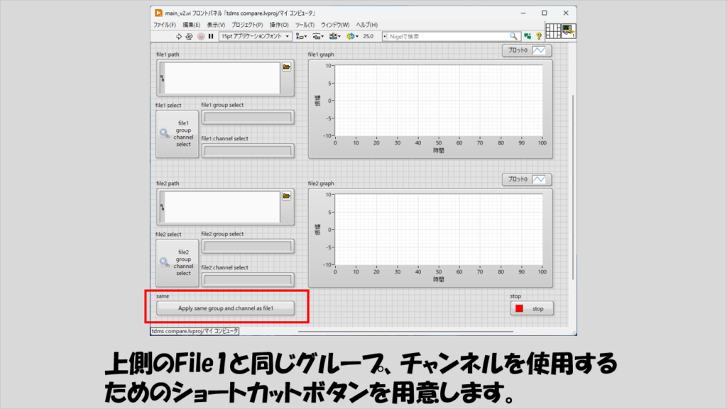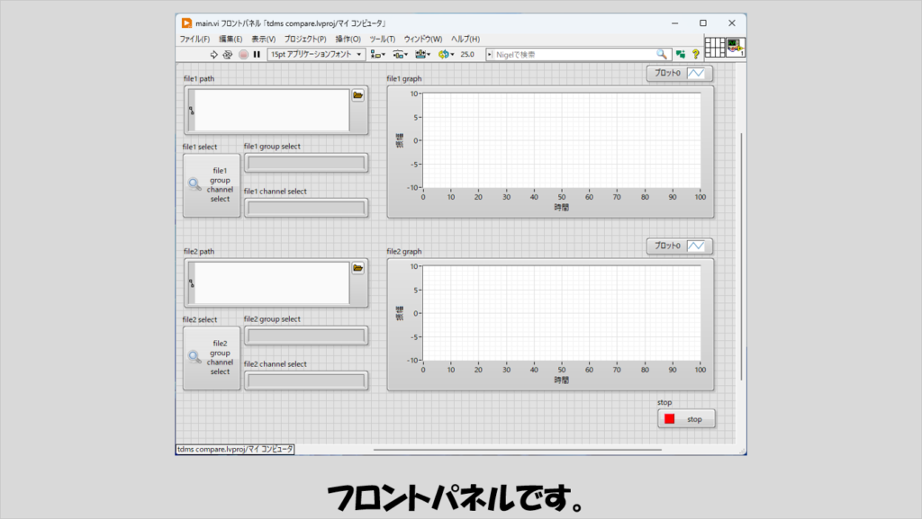 フロントパネルにはtdmsファイルを選ぶパス制御器、グループ名やチャンネル名を表示する文字列表示器、それぞれのファイルに対して設定を開始するためのブール制御器と結果を表示するグラフ表示器を配置しています。