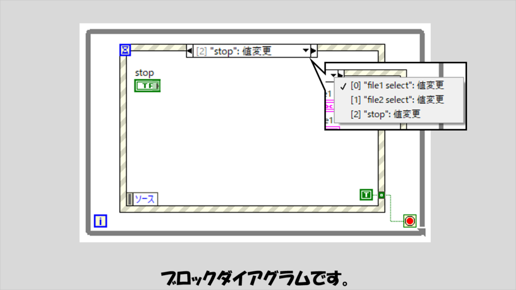 メインVIとサブVIはUIは独立しているため、サブVIの方でもイベントストラクチャを使用して特に問題は起こりませんが、グループとチャンネル二つを順番に選ばせる仕組みをイベントストラクチャで行わせようとすると少し面倒なので、実装が簡単な組み方で表現しました。