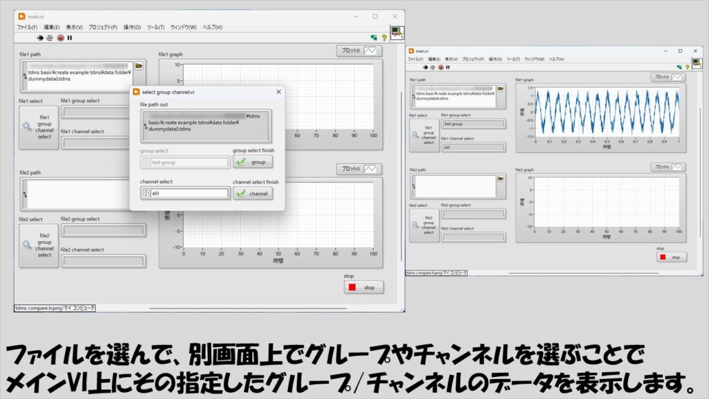 測定して得られたデータを比較するという場面で、一つのvi上でそれぞれの結果を表示させること自体そこまで難しいものではない話ですが、メインとなるviには表示する機能だけを持たせて、サブVI側でグループやチャンネルを選ぶようにして、結果を表示するスペースを大きくしてみました。