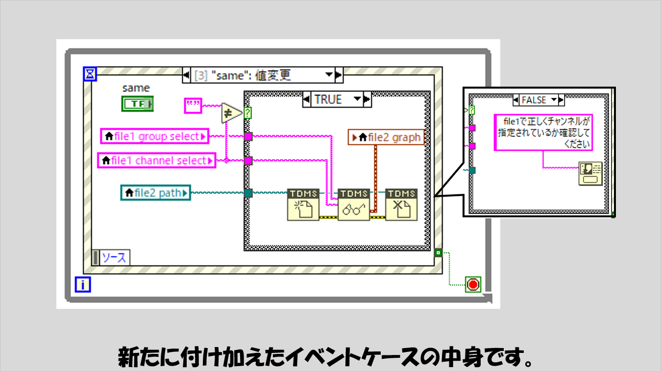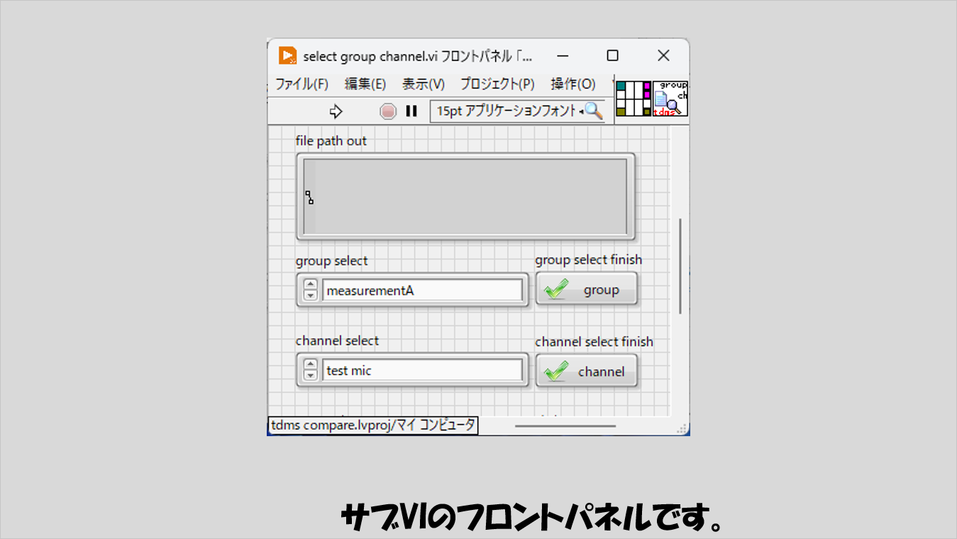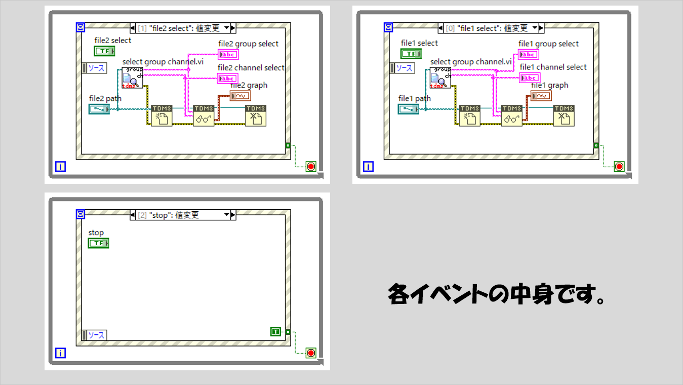 メインVIとサブVIはUIは独立しているため、サブVIの方でもイベントストラクチャを使用して特に問題は起こりませんが、グループとチャンネル二つを順番に選ばせる仕組みをイベントストラクチャで行わせようとすると少し面倒なので、実装が簡単な組み方で表現しました。