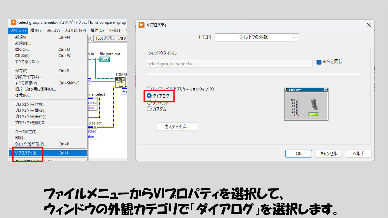 このサブVIのVIプロパティで設定を忘れずに行っておかないとメインVIから呼び出されてもサブVIのフロントパネルが表示されないので注意して下さい。